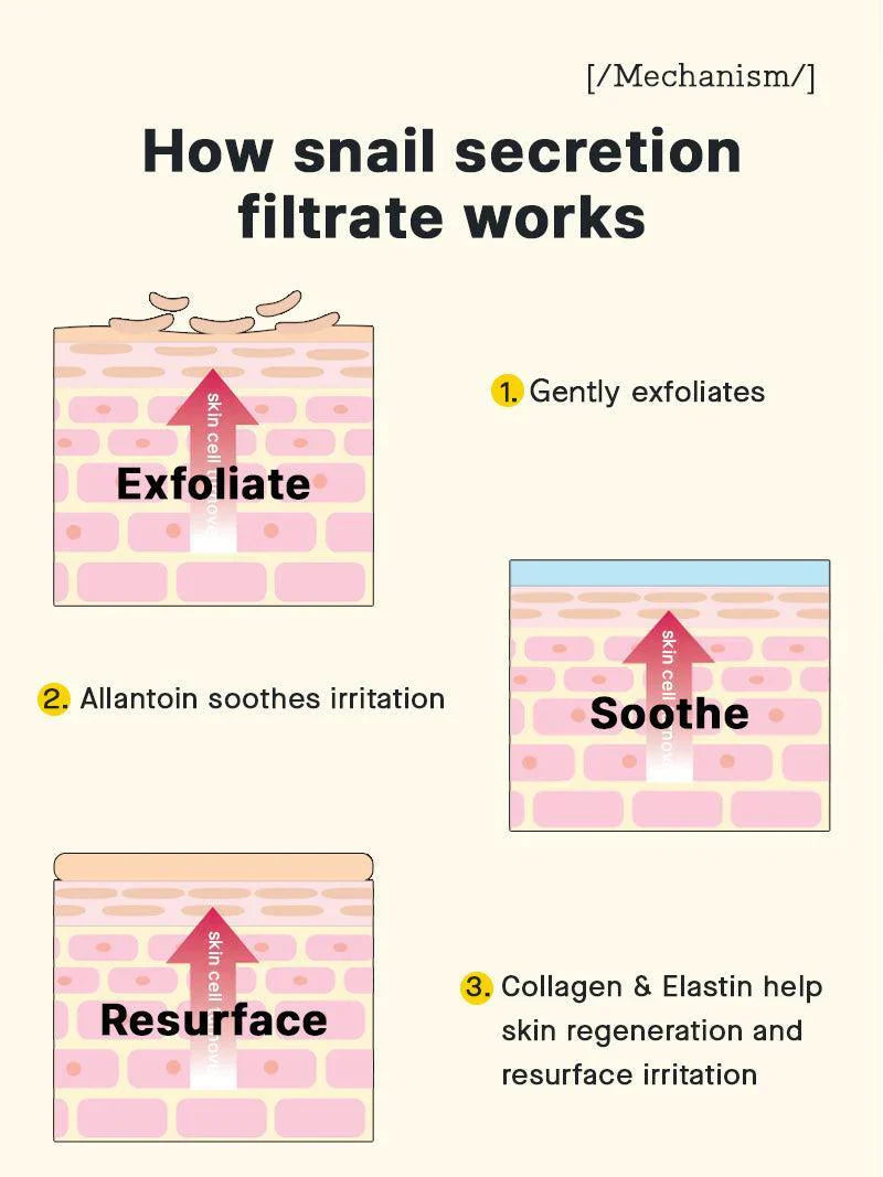 Snail Secretion Filtrate, Betaine, Butylene Glycol, 1,2-Hexanediol, Sodium Polyacrylate, Phenoxyethanol, Sodium Hyaluronate, Allantoin, Ethyl Hexanediol, Carbomer, Panthenol, Arginine